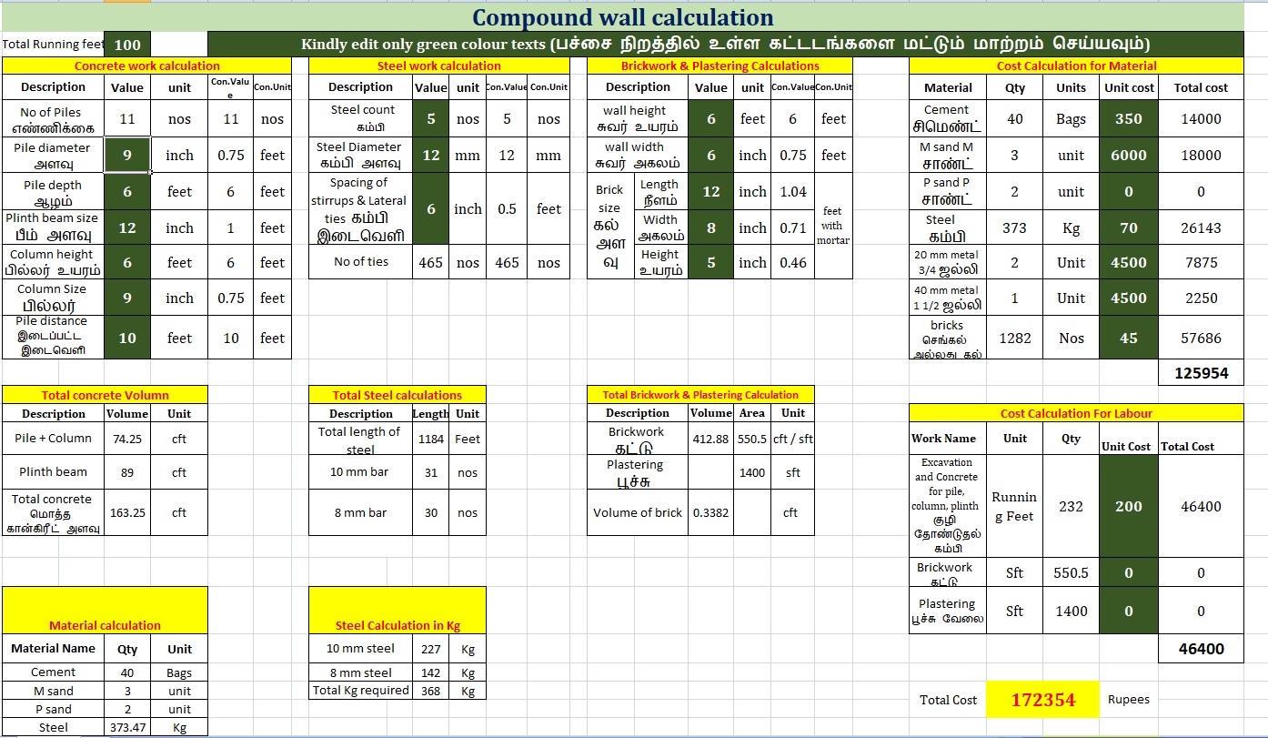 Compound wall Estimation excel sheet in Tamil