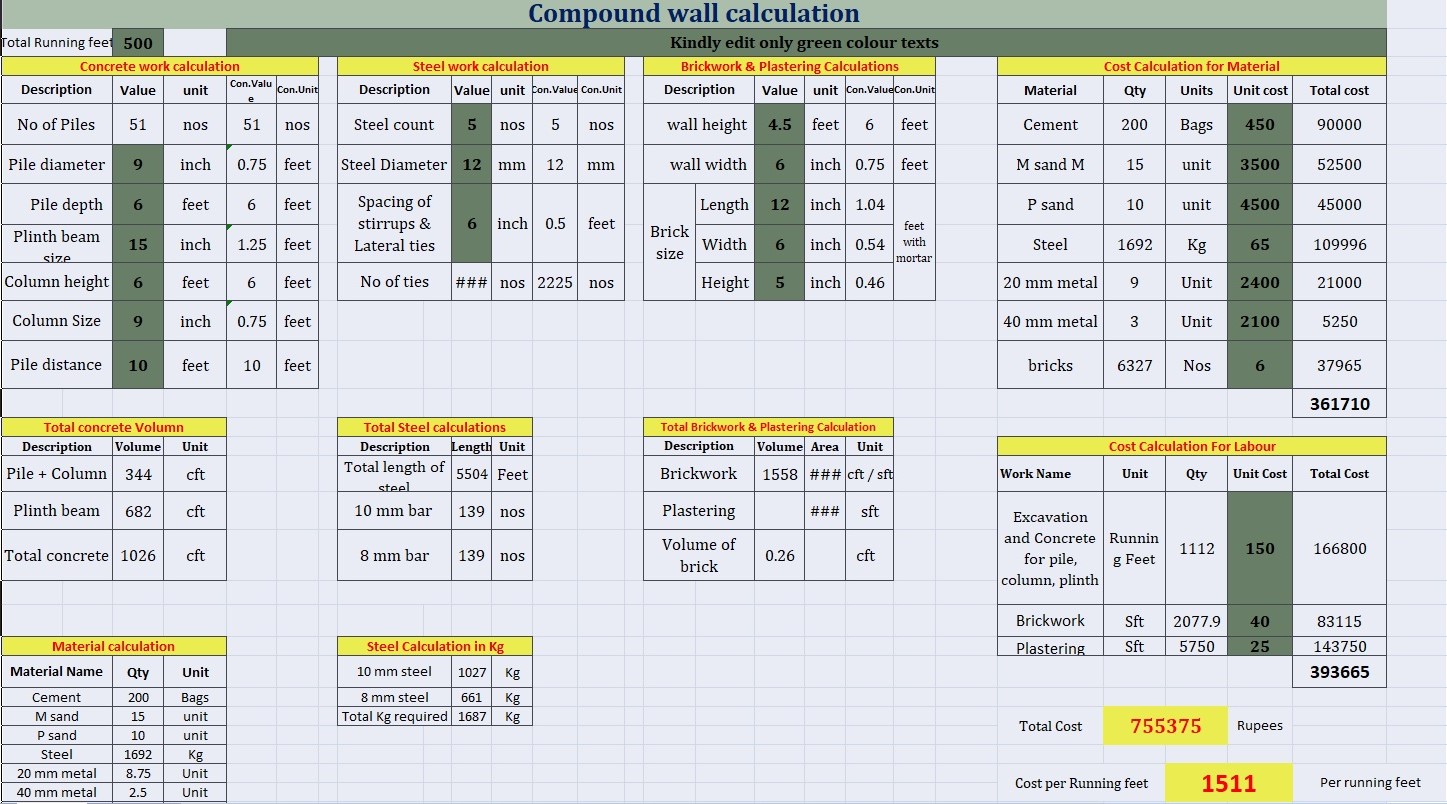 Compound wall Estimation excel sheet in English